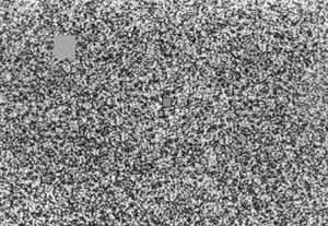 FIG. 1 Stimulus used to produce an artificial perceptual scotoma. The background consisted of twinkling spots of eight different grey levels. The square subtended 1.5? x 1.5? and it had the same mean luminance (50 cd-m-2) as the twinkling texture. The fixation spot was about 6? away from the border of the square. On steady fixation the square vanished in about 5s and was filled in by the twinkling noise in the surround. A similar fading and filling in of texture was originally described by Ramachandran and Anstis [REF 7] and Ramachandran [REF 8] but in their stimulus the square was a 'window' filled with horizontally moving dots rather than a homogeneous grey. Also, we found that if the square was very small (<0.2?) it could be seen to vanish even if it was very bright or dark, that is non-equiluminous with the surround. (The effect could then be seen even if the fixation spot was only 2? from the square.) The fading occurred even more quickly (< 2 s) if the square was in a different stereoscopic plane (nearer or further) than the twinkling texture. This was confirmed by all four subjects.