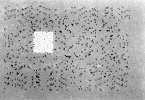 FIG. 2 Schematic illustration of stimulus used to demonstrate independent filling-in mechanisms for colour and twinkling texture. The homogeneous grey square subtended 2.6? x 2.8?. The black spots in the square subtended 5 minutes of arc and moved horizontally as in a 'conveyor belt'. The surround consisted of randomly flickering ('twinkling') black spots on a homogeneous pink background (depicted dark grey) whose mean luminance was the same (80 cd m2) as the grey square. The background subtended 19? x 15?. Four subjects were asked to view this display and asked whether the twinkle and colour both filled in at the same time, the twinkle filled in first, or the colour filled in first. On most trials the subjects reported that the colour filled in first (mean = 2.83 s; n = 40) followed a few seconds later by the twinkling noise (mean = 4.05 s).