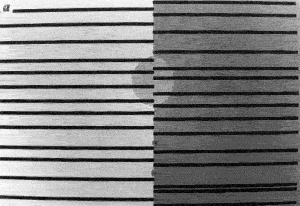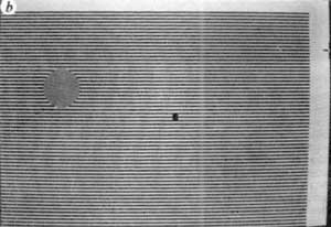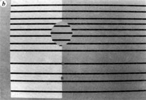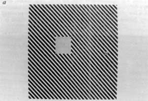 3b, In this display we have stationary continuously visible horizontal lines instead of a counterphase flickering grating. Fading and filling in can be seen after 15-20 s of steady eccentric fixation. We find that one out of every five or six subjects cannot achieve the steady fixation required for this effect. Also, on some trials the entire pattern fades (as in 'Troxler fading' [REF 30]) instead of the square, an effect that is rarely seen in Fig. 1. | ![]() |