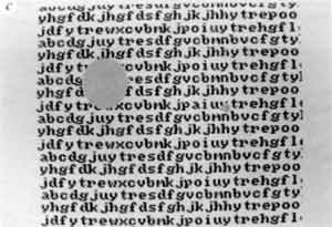 Is the filling-in process specific to the pattern in the surround? We tried to answer this by using displays such as Fig. 3a, in which the surround was a diagonal twinkling ('counterphase flickering') square wave grating. We waited for fill to occur, then replaced the background lines with twinkling two-dimensional noise. Subjects typically reported that this procedure restored the grey square momentarily (1 s) and that it had to be filled in again by the new twinkling texture in the surround. Scotomas can also be produced, although less vividly, using stationary patterns such as Fig. 3b and c. In Fig. 3b the surround consists of a stationary horizontal square wave grating, and in Fig. 3c it was composed of ordinary type-written English, Latin, or 'nonsense' text. The filling in of text was especially striking and was reported by all four subjects, although, needless to say, none of them could actually read the text within the filled-in region.